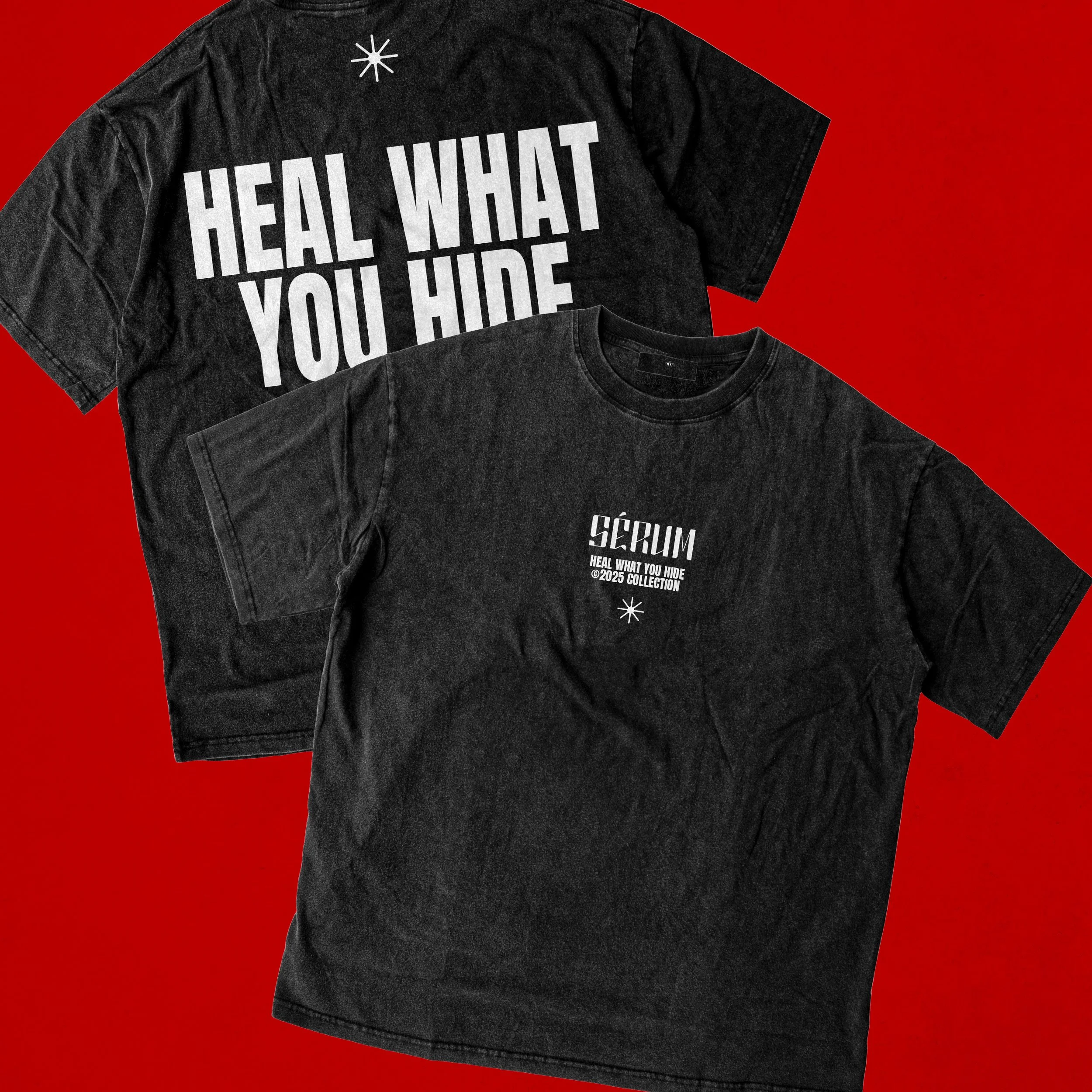 Le nom de la marque SÉRUM évoque la guérison ; la baseline “Heal what you hide” agit comme un mantra. L’ensemble fonctionne comme un label : brut, sensible, assumé. Une identité pensée pour vivre aussi bien sur textile que sur affichage.